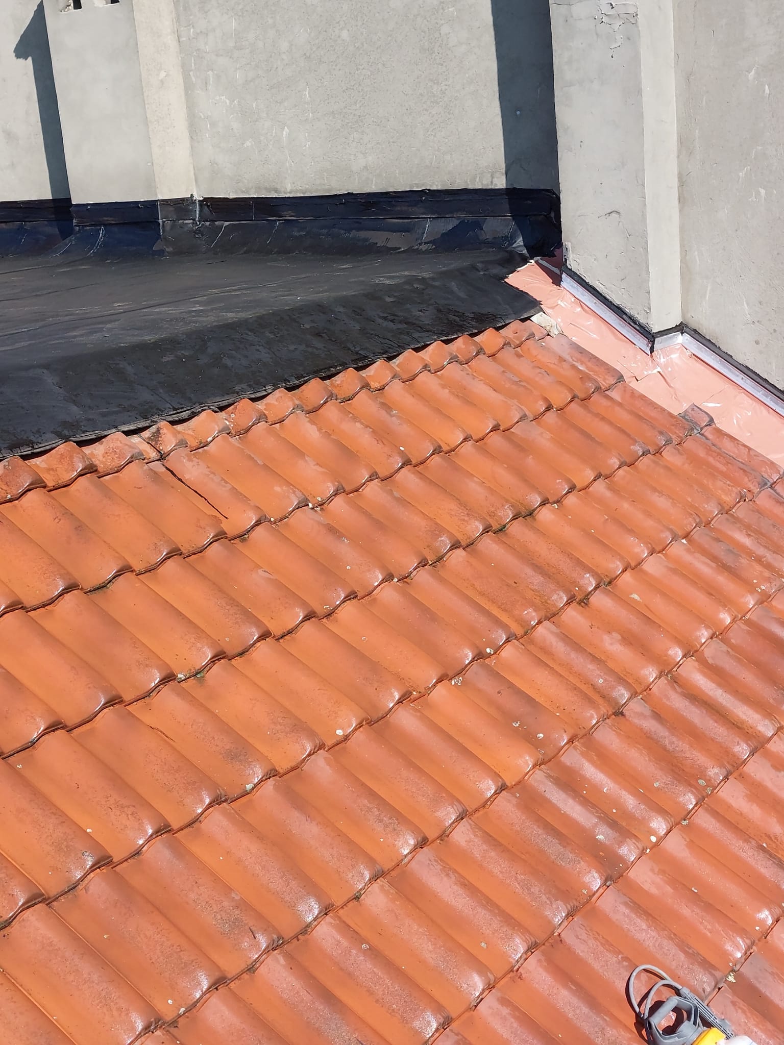 Traitement hydrofuge incolore sur l’ensemble de la toiture (tuiles). Mise en étanchéité d’un toit terrasse (plat) réfection des soudures remplacement de quelques plaques de goudron. Cimentation de la cheminée (mortier hydrofuge) sur Bordeaux 33072